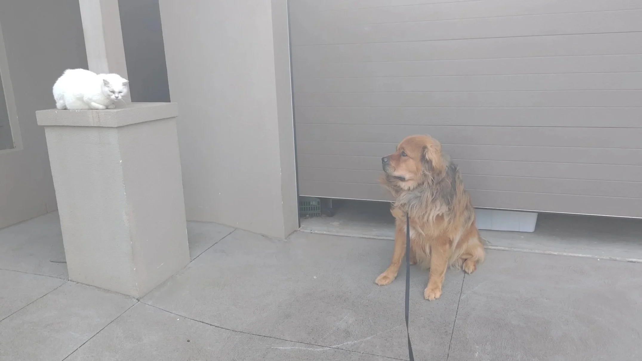 It’s not the best picture, but here is the first cat that allowed Rollo to approach. They are friends, and can make physical contact with each other without issue. All done without a muzzle, and both animals always have the option to refuse the interaction at any point.